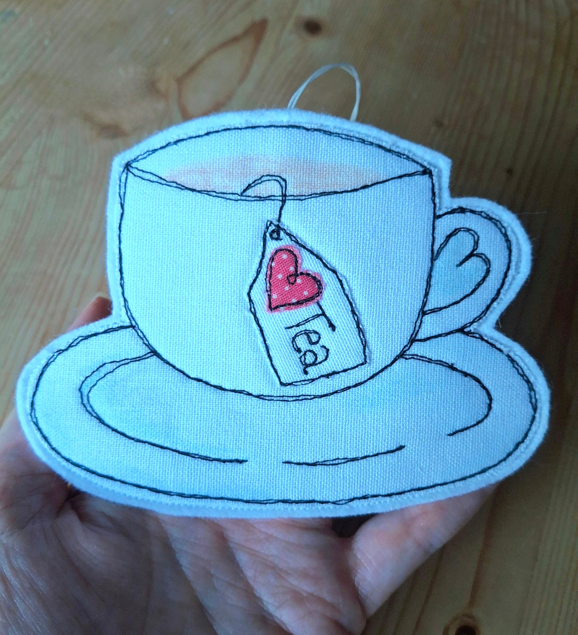 This cute teacup decoration was cut by hand from several layers of fabric/wool felt and embellished with free-motion stitching to create a truly unique design. It comes complete with a cotton hanging loop so you can suspend it in a room of your choice.