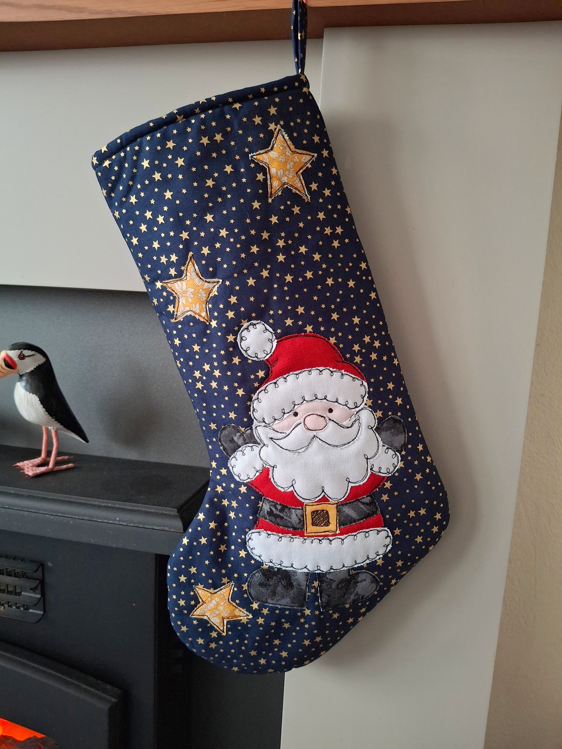 This truly unique Christmas stocking has been created using a gorgeous dark blue cotton fabric with printed gold stars. Father Christmas has then been added to the front of the stocking along with 3 yellow stars, using free-motion embroidery to create a beautiful festive design. The inside is lined with a lovely neutral cotton fabric and it is lightly padded to keep it's shape when it's filled with all your lovely stocking fillers...